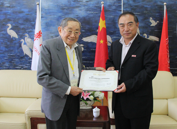 贾益民向来校出席捐赠仪式的郑年锦颁发永利集团304am登录第六届董事会副董事长聘书